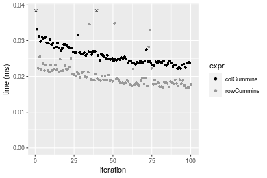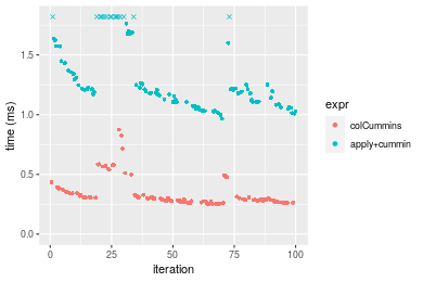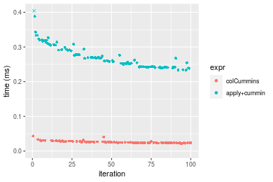 > colStats <- microbenchmark(colCummins = colCummins(X), `apply+cummin` = apply(X, MARGIN = 2L, FUN = cummin),