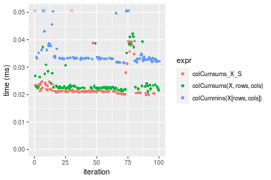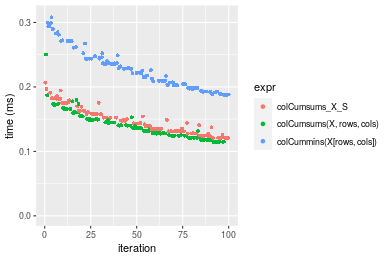 | 3 | colCummins(X[rows, cols]) | 0.190537 | 0.2106785 | 0.2312126 | 0.2282060 | 0.2427230 | 0.421410 |