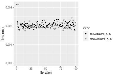 > rowStats <- microbenchmark(rowCumsums_X_S = rowCumsums(X_S), `rowCumsums(X, cols, rows)` = rowCumsums(X,