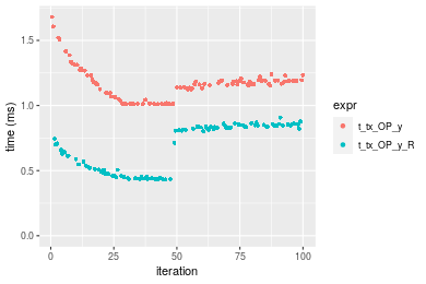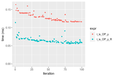 > stats <- microbenchmark(t_tx_OP_y = t_tx_OP_y(x, y, OP = OP, na.rm = FALSE), t_tx_OP_y_R = t_tx_OP_y_R(x,